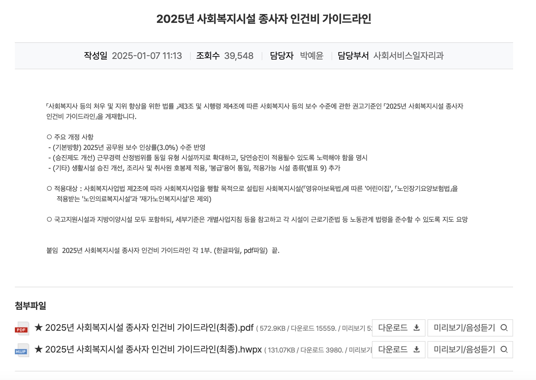 2025년 사회복지시설 종사자 인건비 가이드라인 < 법인/시설/단체 < 정보 : 보건복지부 대표홈페이